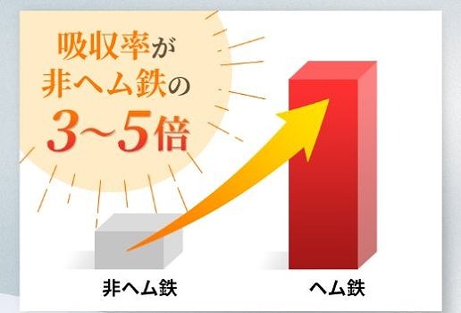 物性食品由来のヘム鉄は、ほうれん草などの非ヘム鉄に比べて吸収率が3〜5倍も高いらしい。